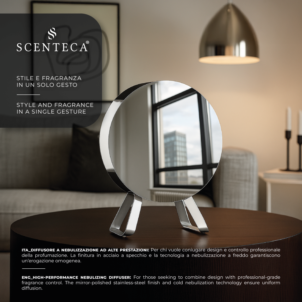 Diffusore Modello Milano — design in acciaio a specchio, profumazione professionale con nebulizzazione a freddo.