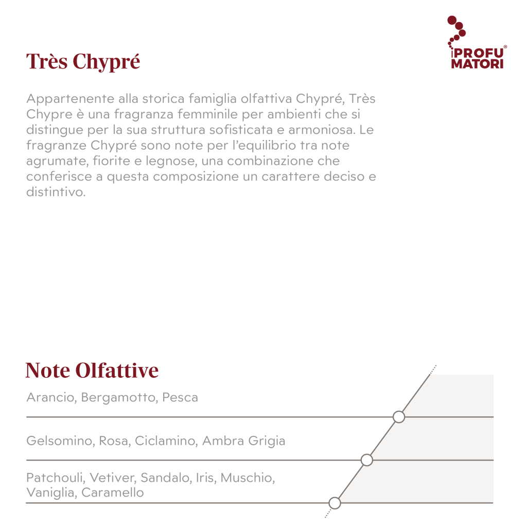 Très Chypre è una fragranza femminile per ambienti, pensata per spazi raffinati. Caratterizzata da un mix elegante di bergamotto, patchouli e gelsomino, questa fragranza femminile per ambienti dona un tocco distintivo a boutique, hotel o ambienti esclusivi.