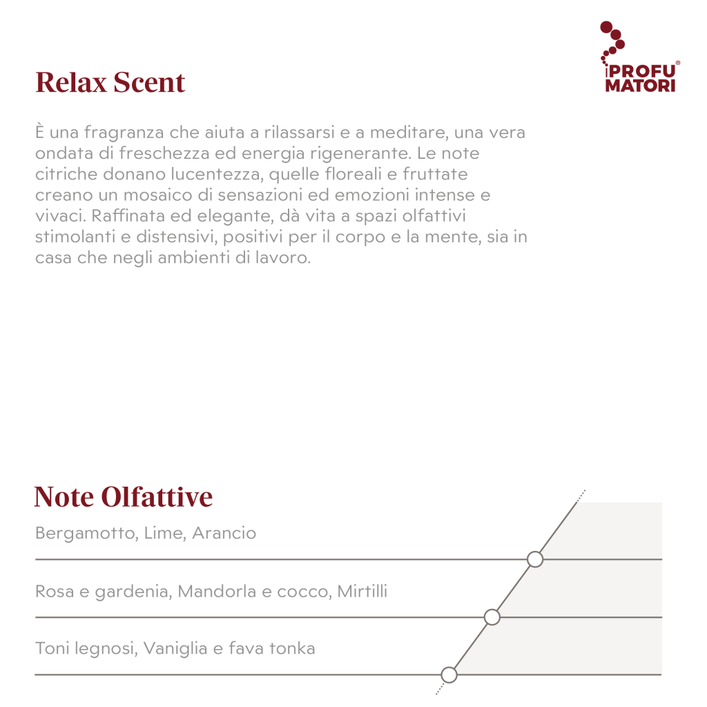 Relax Scent è una fragranza floreale, fresca e piacevole caratterizzata da un tripudio allegro di frutti e fiori. Una miscela che si chiude con note dolci, morbide e talcate. Il suo profilo olfattivo la rende perfetta per rilassare il corpo e la mente e per infondere benessere psicofisico.