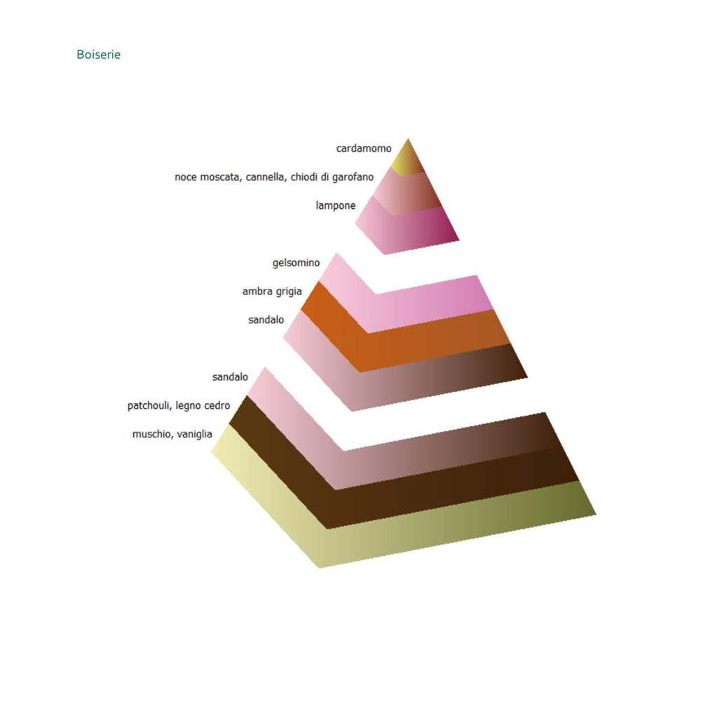Boiserie è una fragranza legnosa, caratterizzata da note sobrie ed eleganti che creano un profilo olfattivo ricco e profondo grazie ai caldi sentori legnosi e muschiati.