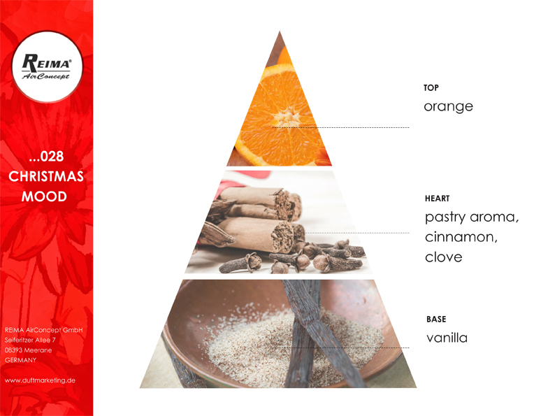 Christmas Mood si apre con l’aroma d’arancia per poi dare spazio alla cannella, ai chiodi di garofano e ai dolci natalizi. Si chiude con una nota di dolcezza data dalla vaniglia.