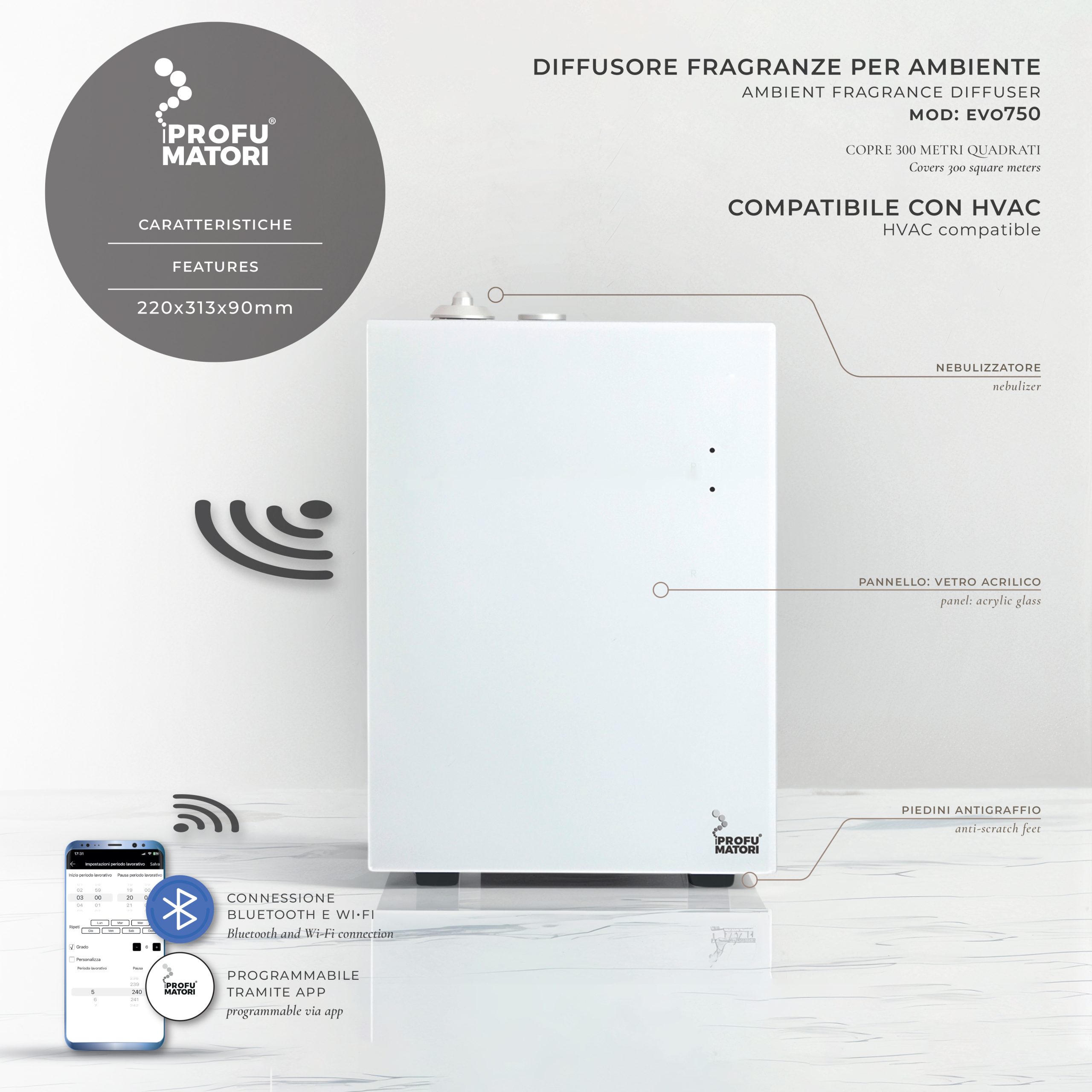 Scegli EVO750 Bluetooth WiFi per valorizzare i tuoi ambienti con una diffusione professionale e una gestione intelligente. Perfetto per chi cerca efficienza, stile e tecnologia in un unico dispositivo.