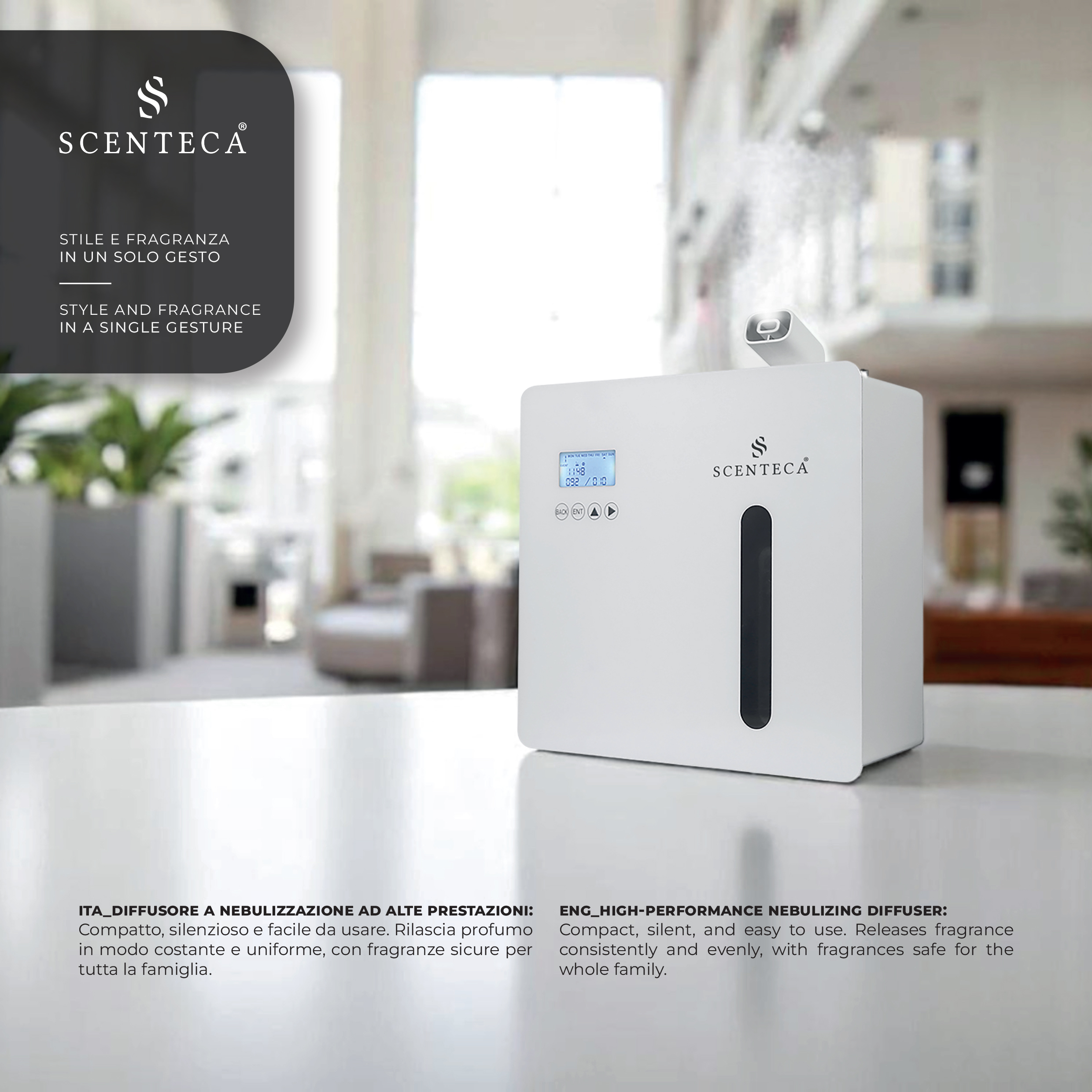 Ideale per case, uffici direzionali, hotel, SPA, studi medici, reception, palestre e ambienti di grandi dimensioni. Il sistema di nebulizzazione a secco garantisce un’erogazione costante, pulita e silenziosa, senza utilizzo di acqua.