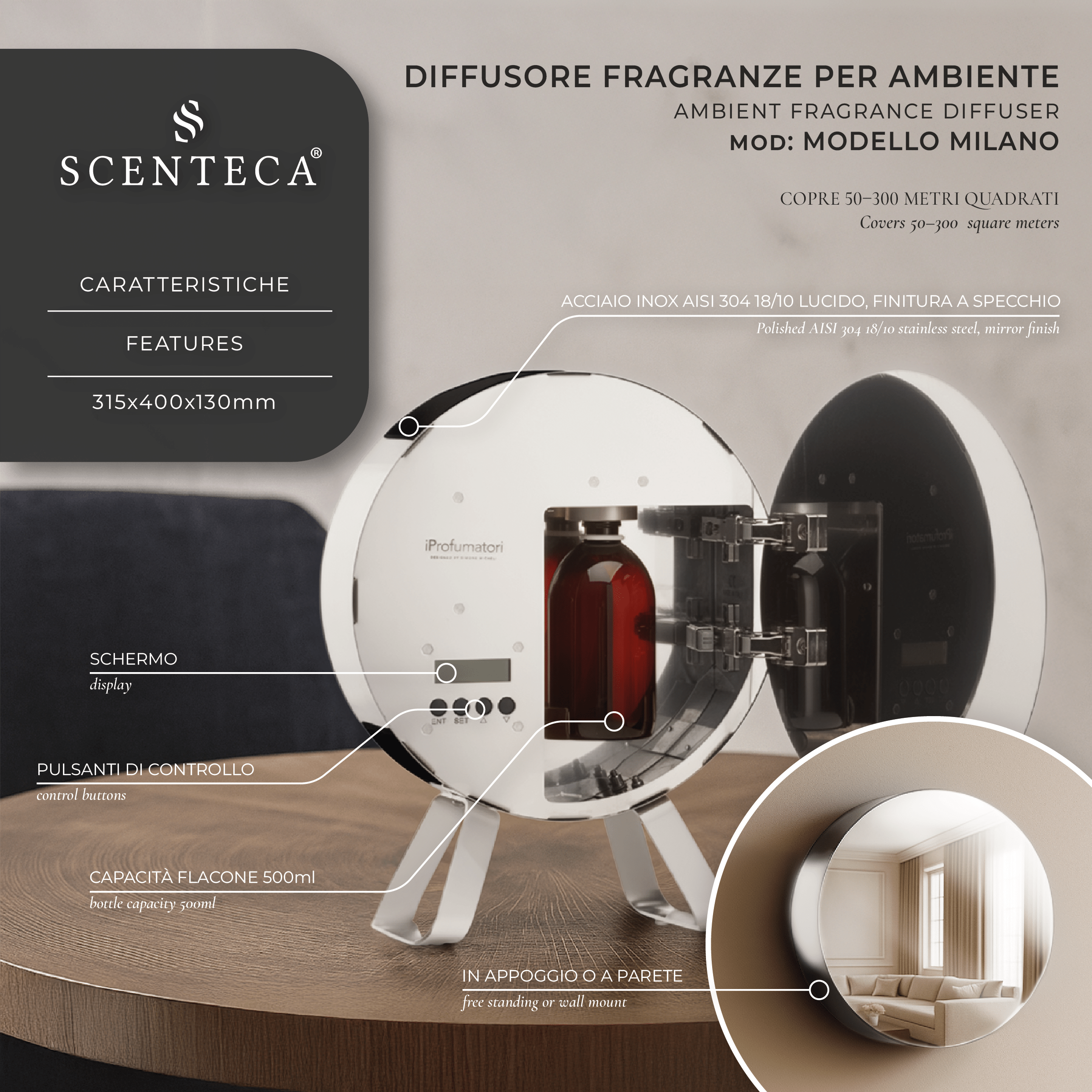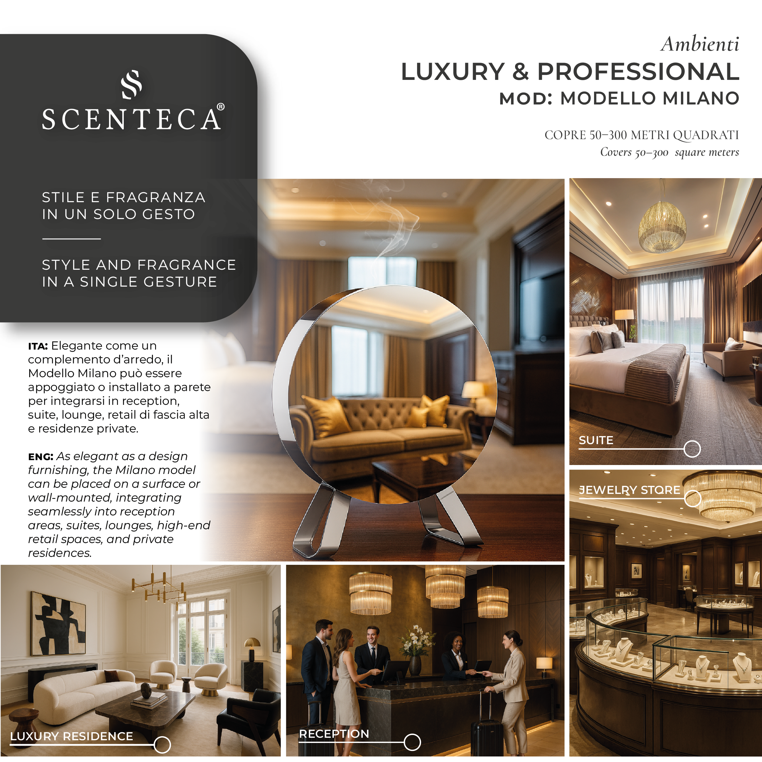 Elegante come un complemento d’arredo, il Modello Milano può essere appoggiato o installato a parete per integrarsi in reception, suite, lounge, retail di fascia alta e residenze private. L’atomizzatore in alluminio anodizzato e la micro-nebulizzazione a freddo stabilizzano la resa, migliorando la percezione di qualità del brand e il comfort di permanenza.