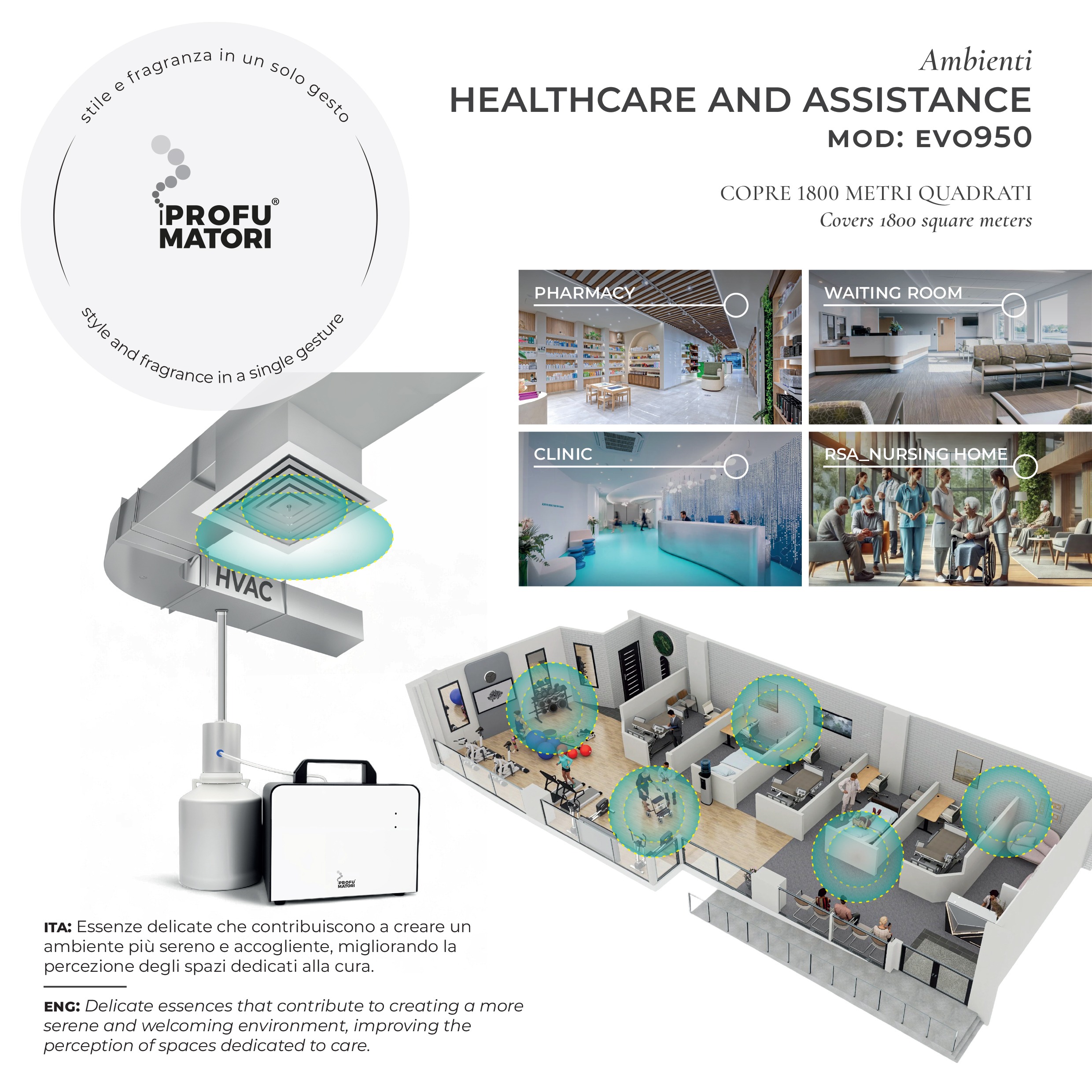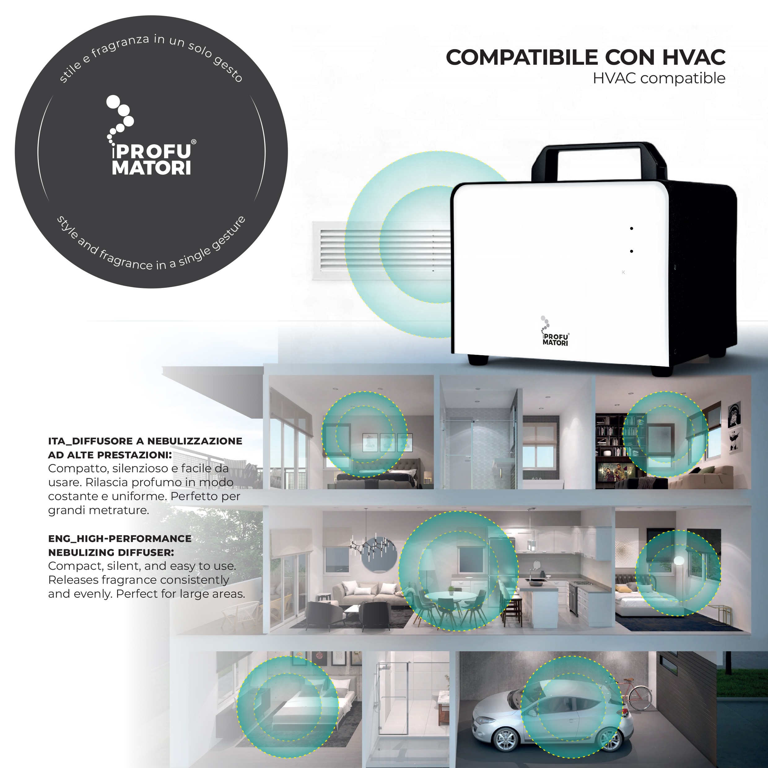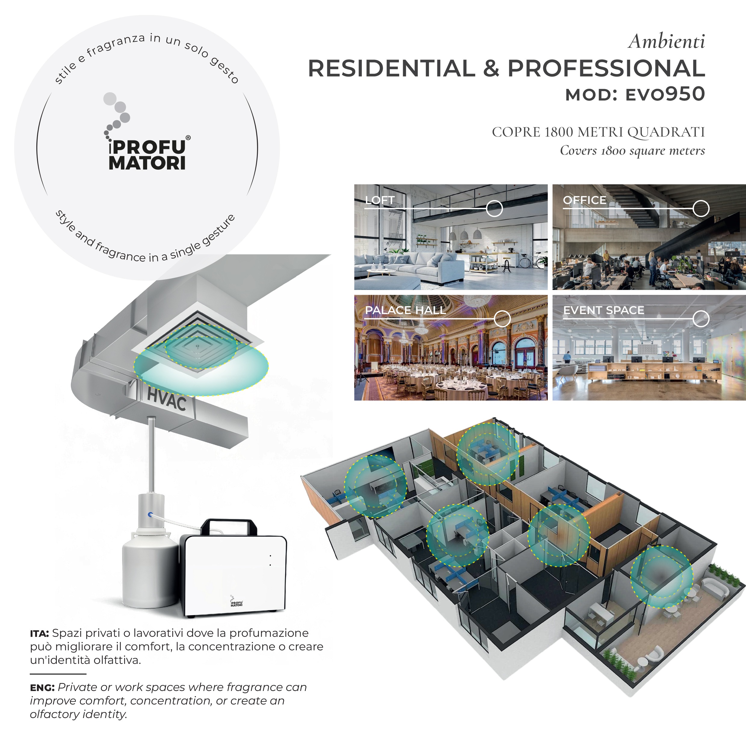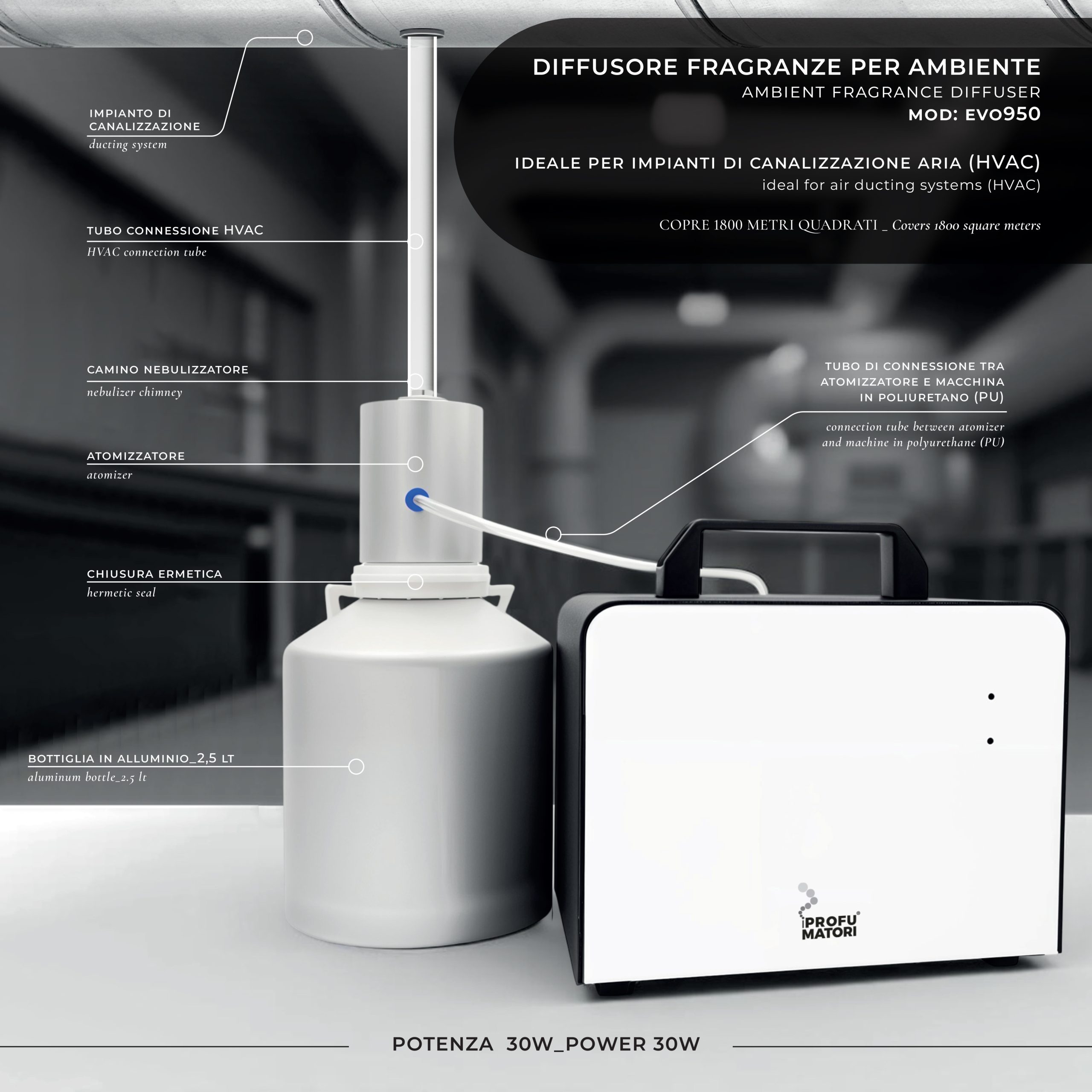 Il diffusore professionale EVO950 è un diffusore di fragranze tecnologicamente avanzato, progettato per garantire una profumazione costante e omogenea in ambienti di grandi dimensioni. Con una copertura fino a 1.800 mq, è la soluzione ideale per aziende, hotel, centri commerciali, showroom, aeroporti, palestre e strutture ricettive che desiderano migliorare l’esperienza olfattiva degli spazi.