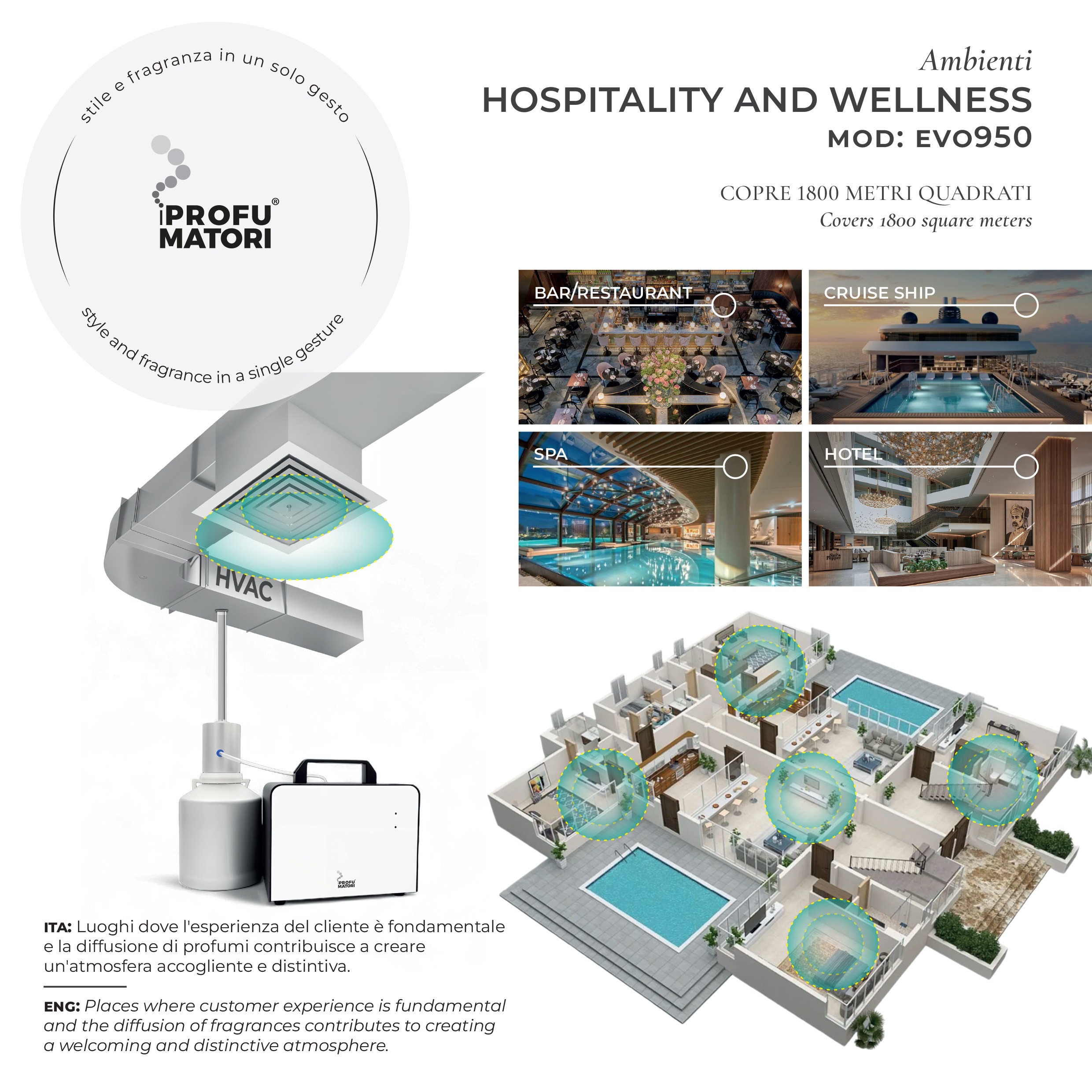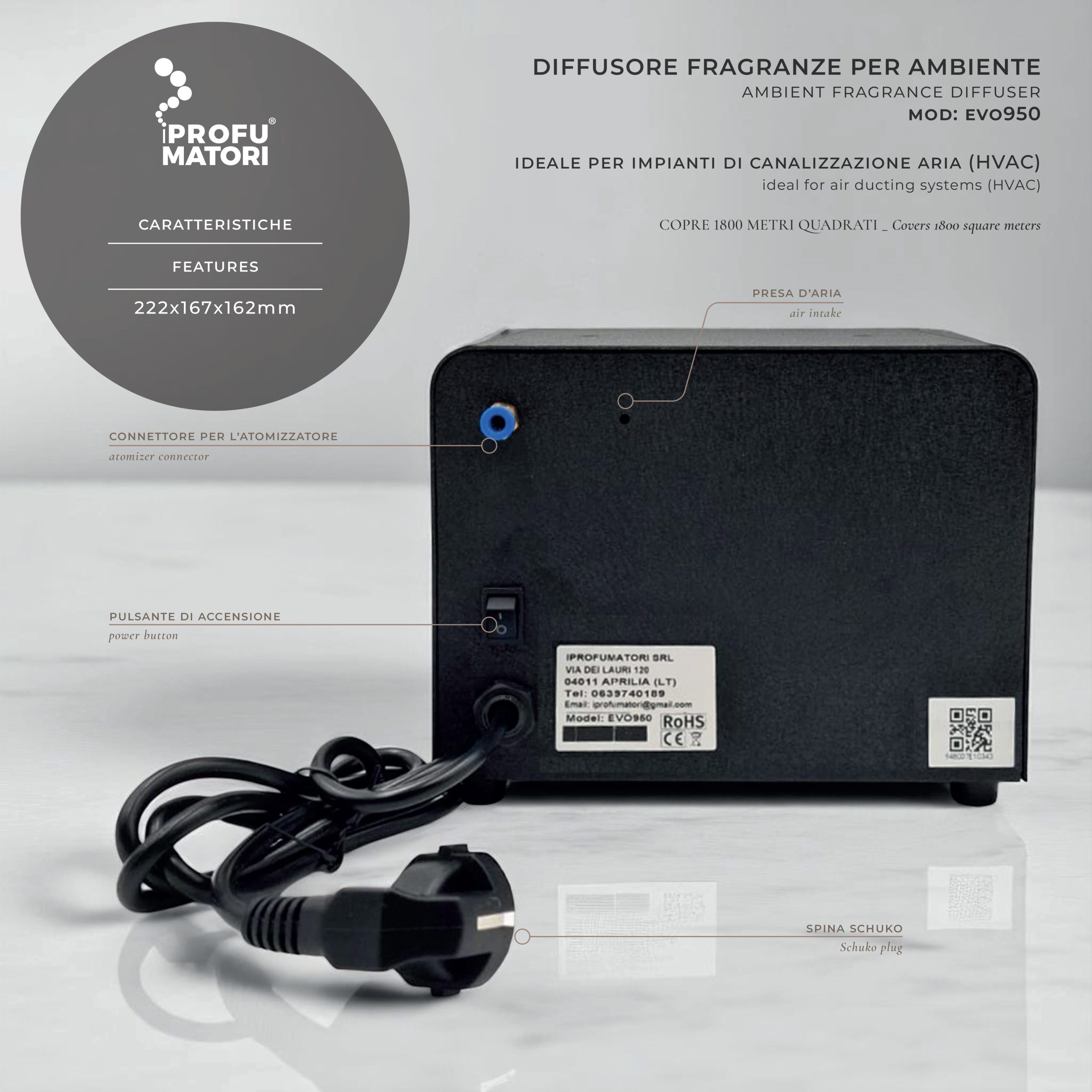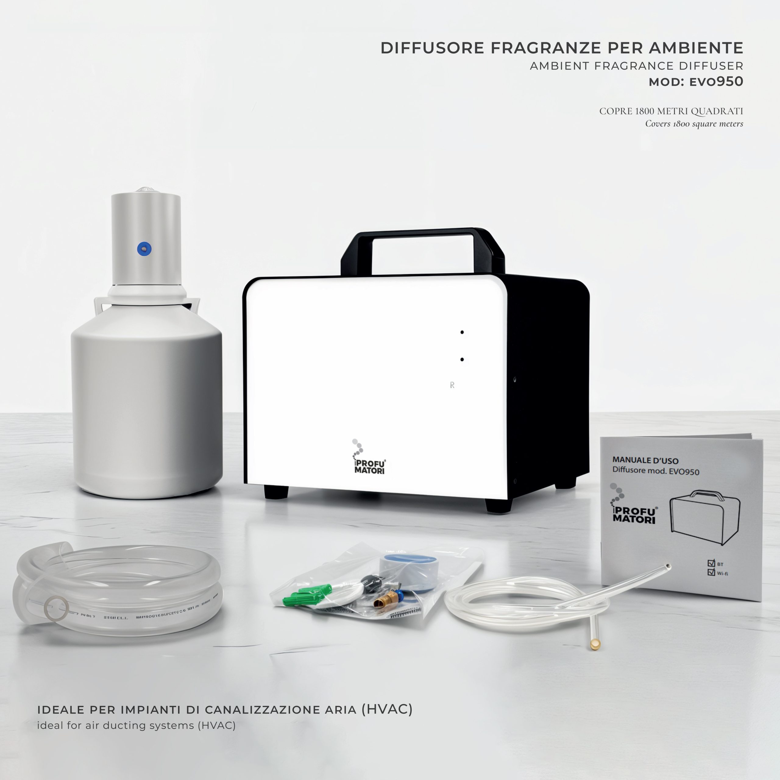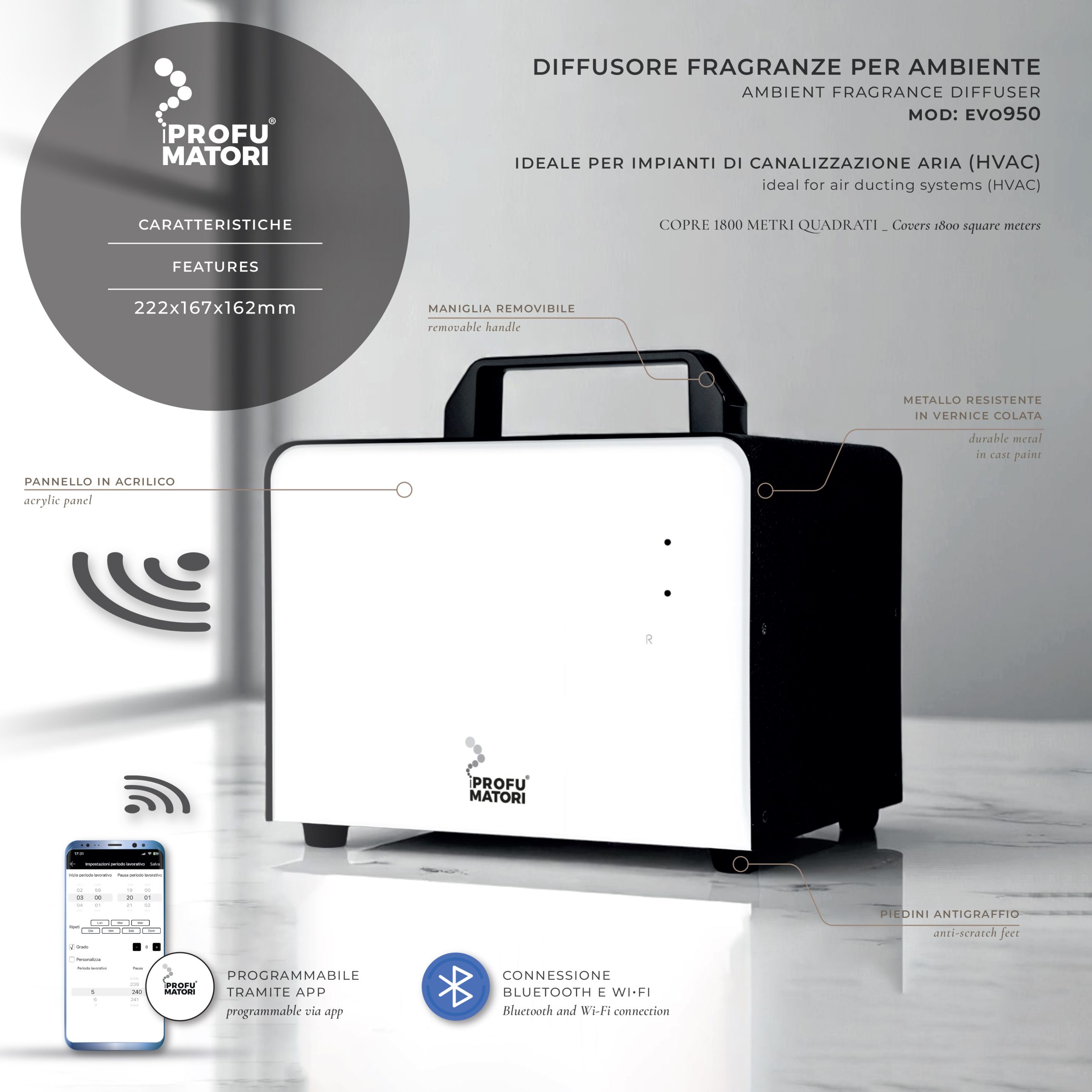 EVO950 è un diffusore professionale con controllo touch e connessione Wi-Fi/Bluetooth. Ideale per ambienti fino a 1.800 mq, garantisce una diffusione precisa e uniforme delle fragranze.