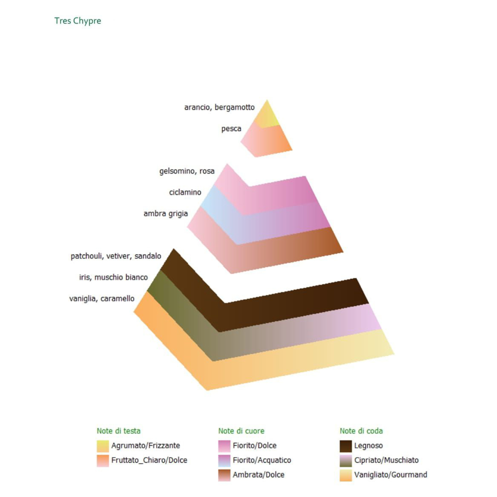 La famiglia Chypré è una delle sette famiglie olfattive classiche, riconosciuta ufficialmente nel 1917 grazie al celebre profumo “Chypre” di François Coty, ispirato all’isola di Cipro. Très Chypre riprende e rinnova questa tradizione con un tocco moderno, mantenendo una struttura olfattiva ricca e sofisticata.